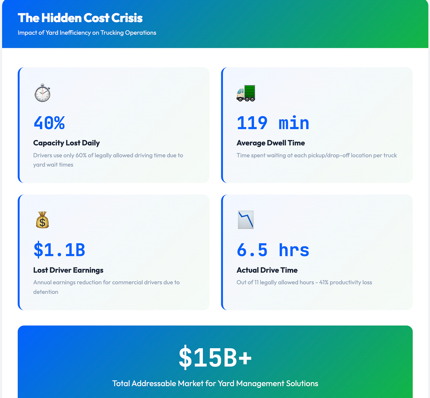 Darin Brannan: Yeah. And so I’ll bring it down to the street and then I’ll bubble it up to the macro view. But the thing that struck me is the biggest problem in the industry relative to the yard is that because it’s under modernized, the tech doesn’t work there the way it should in terms of real orchestration, real movement, real efficiency, real velocity, visibility. It’s created nearly a 30 to 40 % under utilization of truck time. Normally you have 11 hours of truck time. It only gets on average six hours. So 40 % and the majority of that is buffered in the art because the scheduling, the... The stage is the minute you’re off schedule by a few minutes, it just creates congestion because everything’s manual written. So that’s the main problem. And then that in terms of the market spend, it’s in a four billion range is the market size for the problem. Yeah, that’s the problem. And then we add, we’re adding security fraud because we have cameras there that can detect all sorts of things. And then we do damage detection. And now you’ve just quadrupled that time.